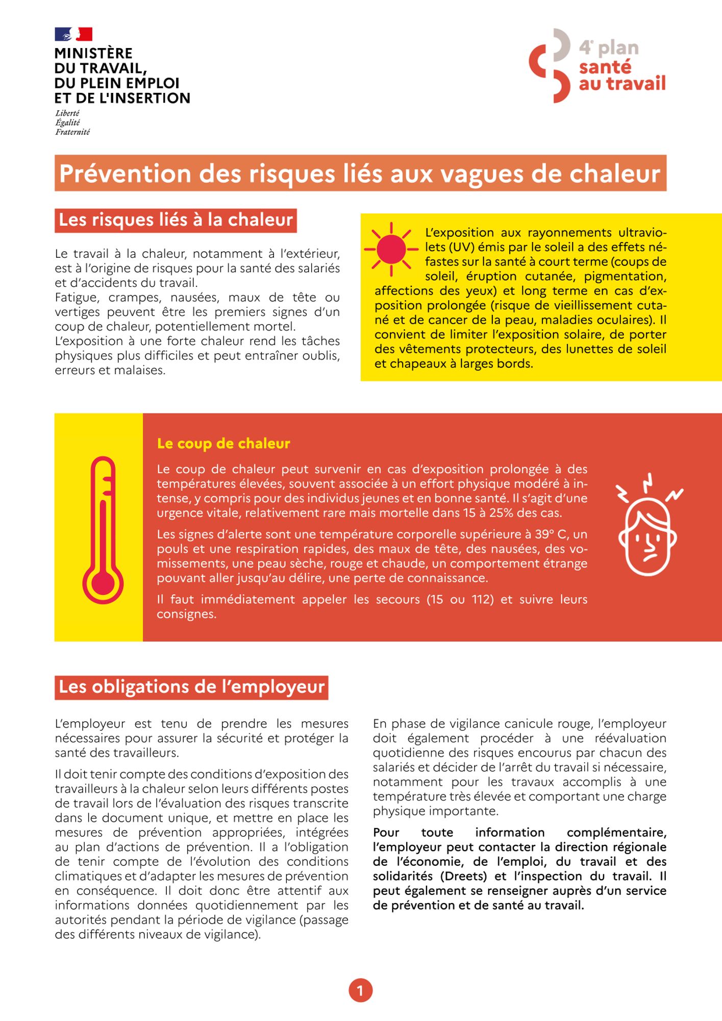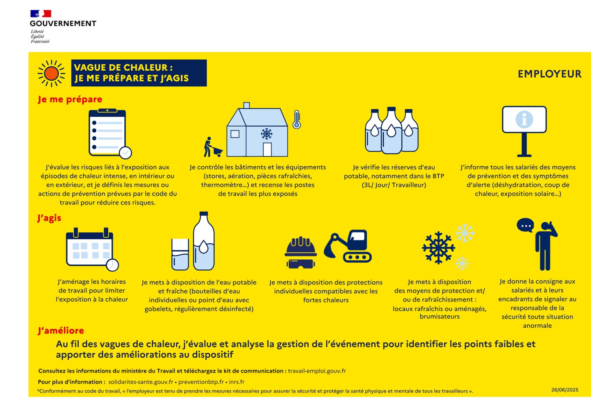 Pour tout savoir sur les mesures de prévention à mettre en œuvre et les dispositions à respecter, consultez l’infographie "Chaleur intense" téléchargeable en PDF dans la colonne ci-contre.