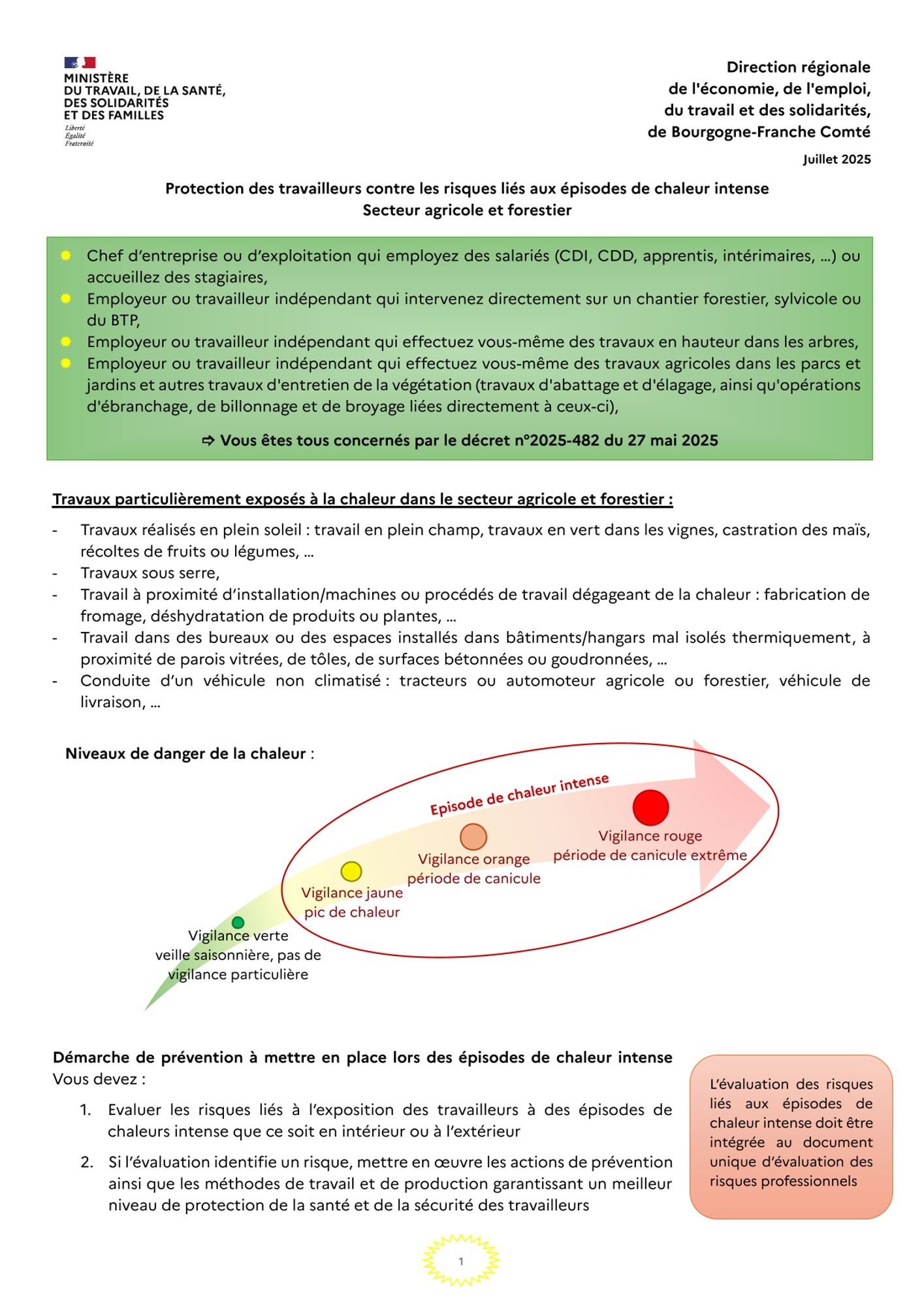 Afin de renforcer leur protection, un décret (n°2025-482 du 27 mai 2025) instaure des obligations aux employeurs en matière de prévention du risque de chaleur. Vous pouvez consulter la vidéo et la fiche d’information ci-contre pour prendre connaissance des principales dispositions du décret applicables depuis le 1er juillet 2025 au secteur agricole ou forestier.