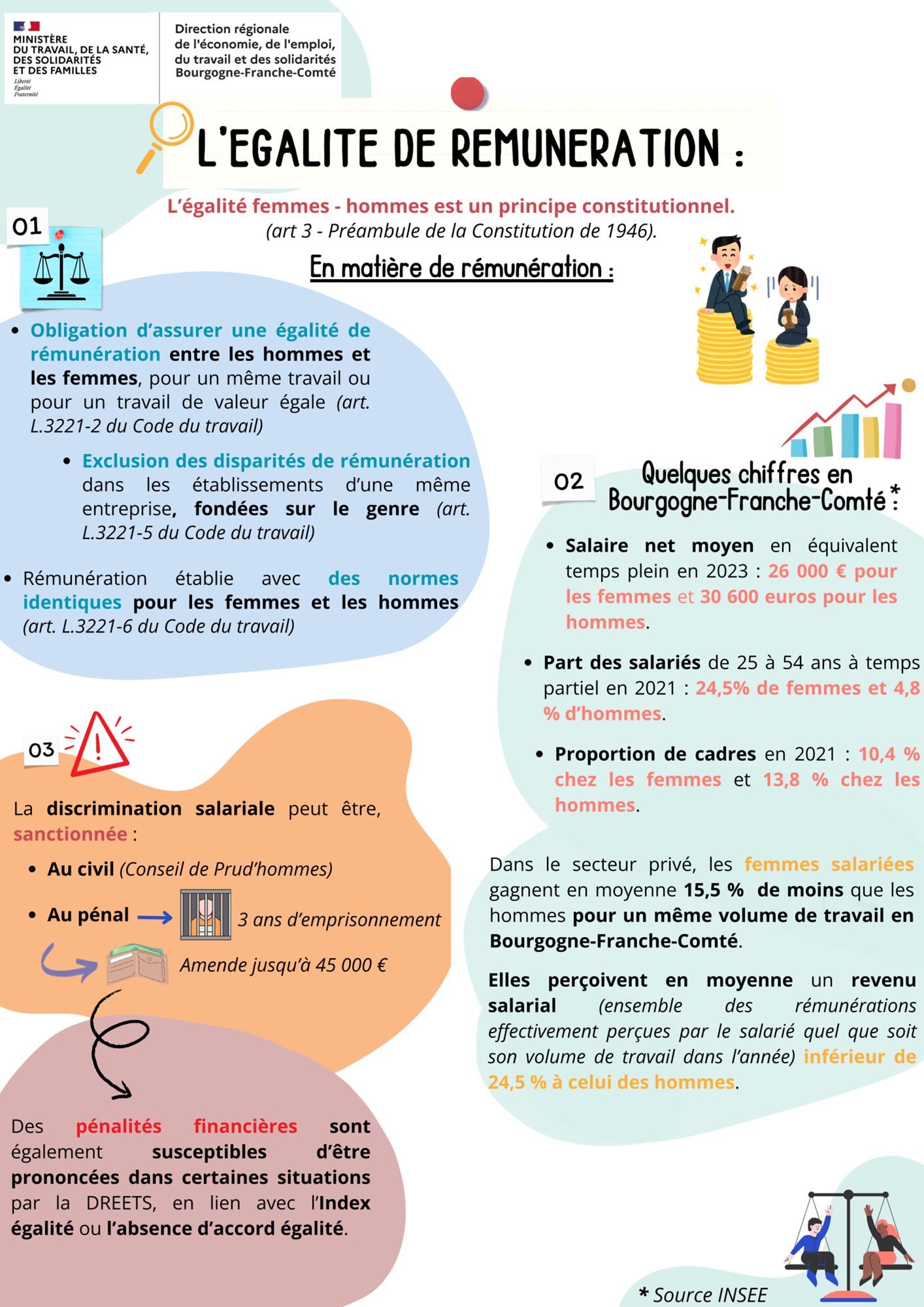 L'égalité salariale entre les femmes et les hommes constitue un principe constitutionnel en droit du travail, visant à garantir une rémunération égale pour un travail de valeur égale. Ce principe est consacré par l'article 3 du préambule de la Constitution de 1946 et par l'article L. 3221-2 du code du travail qui interdit toute discrimination salariale fondée sur le sexe.